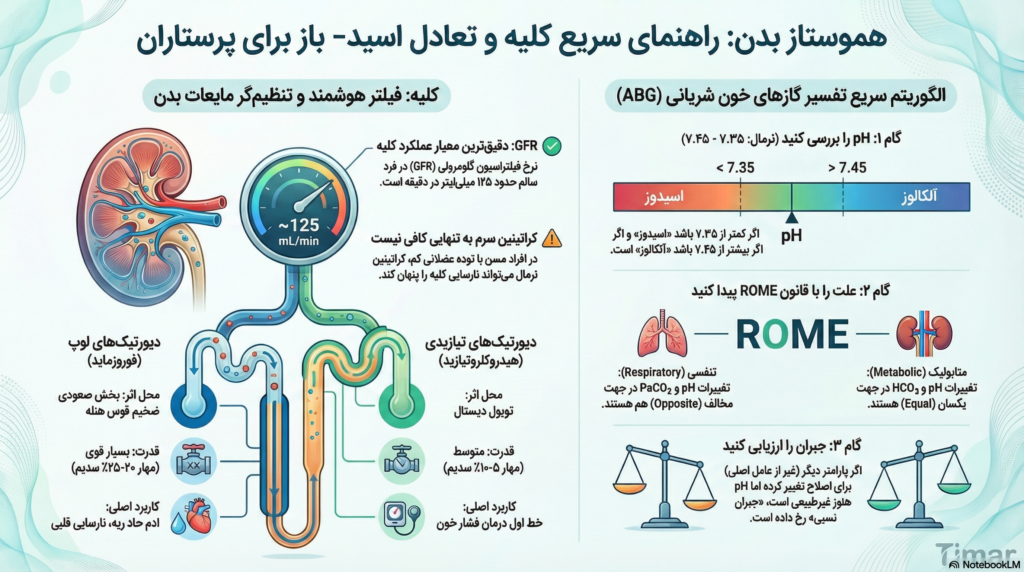 مقدمه: درک عمیق فیزیولوژی انسان، سنگ‌بنای عملکرد بالینی موثر در پرستاری، به ویژه در بخش‌های مراقبت ویژه (ICU)، دیالیز و بخش‌های داخلی-جراحی است. این گزارش جامع، با رویکردی تخصصی و آموزشی، به تشریح دقیق مکانیسم‌های کلیوی و گوارشی دخیل در هموستاز می‌پردازد و ابزارهای لازم برای تصمیم‌گیری بالینی را در اختیار تیم پرستاری قرار می‌دهد.