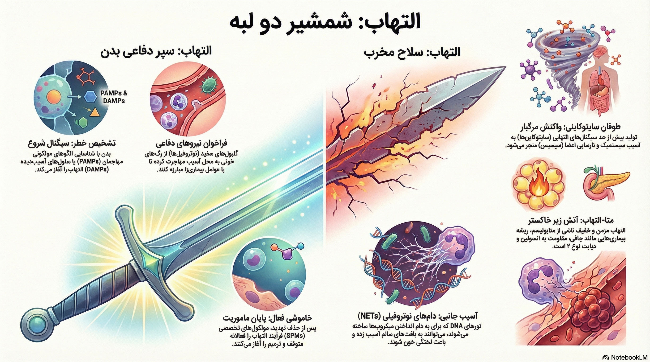 تاریخچه شناخت ما از التهاب به توصیفات کلاسیک سلسوس (Celsus) در قرن اول میلادی باز میگردد که چهار علامت اصلی قرمزی (Rubor)، تورم (Tumor)، گرما (Calor) و درد (Dolor) را معرفی کرد. بعدها ویرشو (Virchow) با افزودن “از دست دادن عملکرد” (Functio Laesa)، تصویر بالینی را تکمیل نمود. با این حال، تحول اصلی در درک ما با کارهای ایلیا مچنیکوف (Élie Metchnikoff) آغاز شد که التهاب را نه به عنوان یک بیماری، بلکه به عنوان یک واکنش فیزیولوژیک محافظتی با محوریت فاگوسیتها تبیین کرد. امروزه میدانیم که این پاسخ ایمنی ذاتی، اگرچه برای حذف خطر حیاتی است، اما نیازمند لایههای متعددی از مکانیسمهای تنظیمی دقیق است تا از آسیبهای جانبی به بافت میزبان جلوگیری شود.
